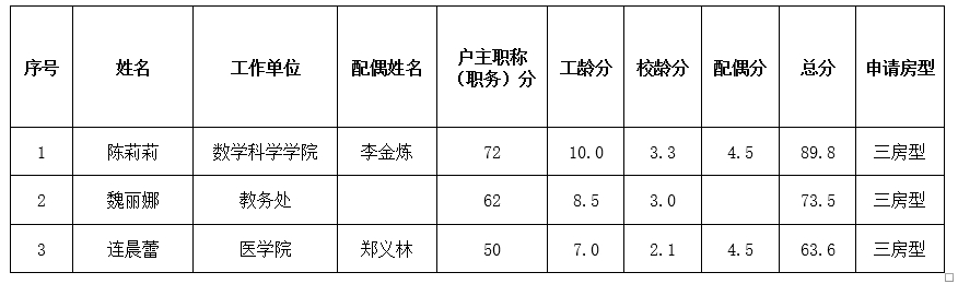 根据《关于开展泉州校区2025年上半年周转房选房工作的通知》(后勤〔2025〕13号)规定,共有3户教职工报名选房。经审查,符合此次选房申请资格的教职工共有3户。现将通过资格审查的人员按《华侨大学住房分配积分计算办法》(华大综〔2009〕87号)进行积分排序,并将《泉州校区2025年上半年周转房选房第一次积分公示表》(附件1)通过后勤与资产管理处网站(http://hqzc.hqu.edu.cn/)进行公示。