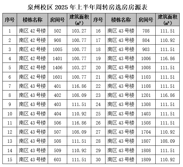 本次选房房源详见《泉州校区2025年上半年周转房选房房源表》(附件2)。
