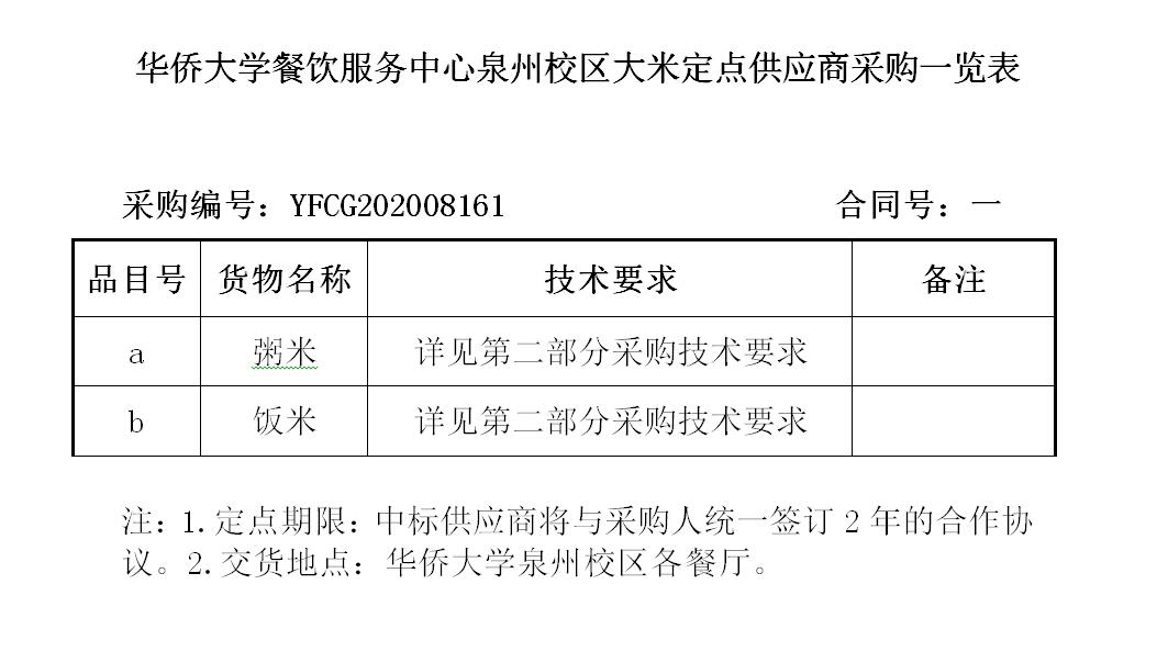 4.采购项目名称、数量、服务及交货期:详见“华侨大学餐饮服务中心泉州校区大米定点供应商采购一览表”。